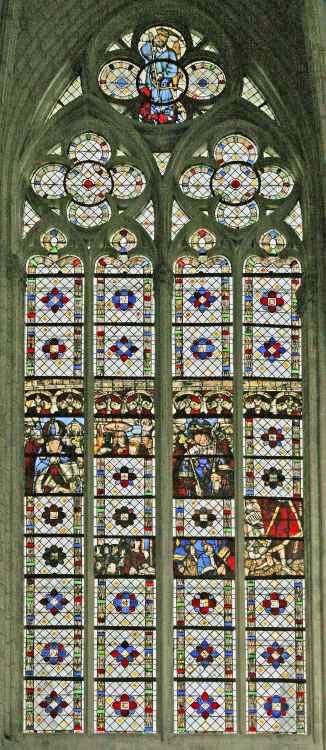 1524. Only parts of the figures and scenes survive; (L to R) St Germain; Mary Magdalene and donors; St Louis with donors below; Christ of "Noli me tangere".