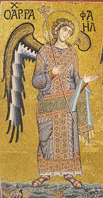 ![]() above: The archangel Raphael in Monreale (Sicily), one of the C12 Byzantine mozaics that probably inspired the C13 Chartres glaziers. Photo from Bob Atchison's wonderful website https://www.pallasweb.com |