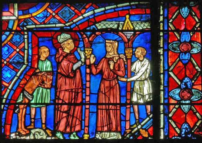 St Remi blesses a woman while on his travels, while an equerry holds his horse