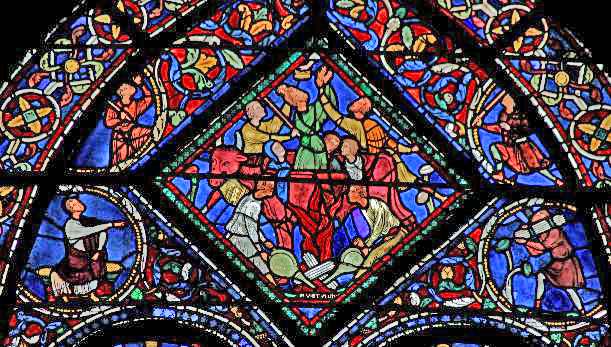 The judge (lwr L) orders Eustache and his family to be burned. Firewood is brought (lwr R)