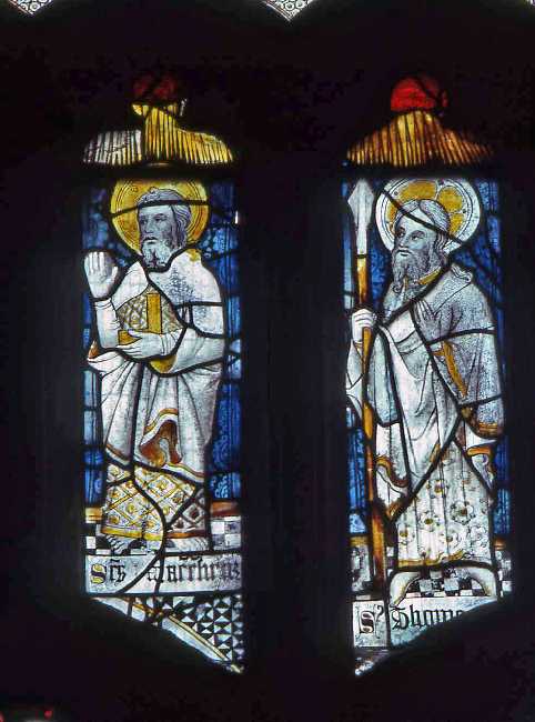 Westham, St Mary Good remains of C15 glass in the tracery lights of the E window, somewhat restored, but displaying thirteen figures, the twelve Apostles with St Paul, each conveniently labelled, carrying a traditional emblem and set on a chequered floor. Paul is given pride of place in the top row, flanked by Sts Peter and Bartholomew with Andrew and St James beyond; in the second row (left to right) are Sts John, Simon, Judas, Matthias, Matthew, Thomas, Philip and James the Less, between two angels at the extremities.