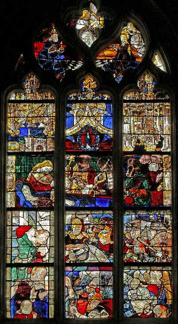 The top two layers contain the Dormition of the Virgin. Below are two panels from a Nativity (originally from window 6), and four of the Via Crucis in later glass by Jean Courtois (and originally from window 14)