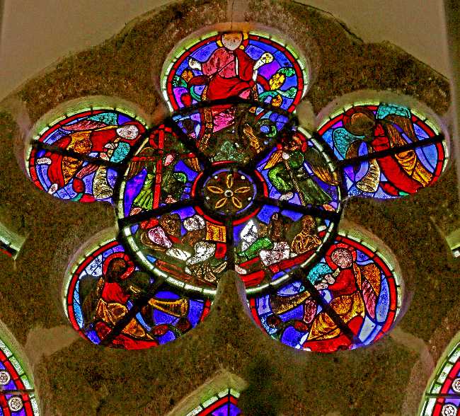 At the summit Christ (modern) and below 4 angels with trumpets whole rose