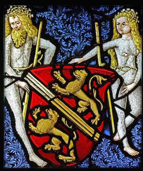 A 'wild man' and 'wild woman' support the arms of the county of Kyburg