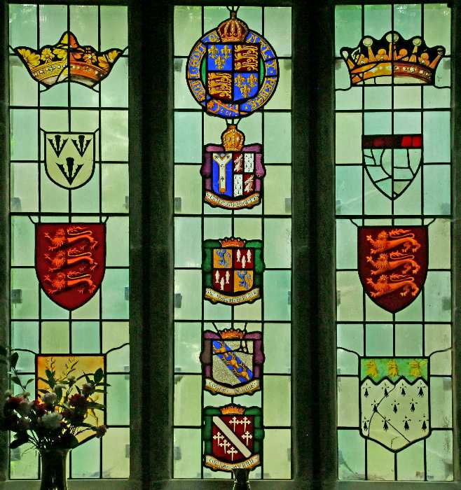 Heraldic glass; the central lancet is C19. The outer lancets contain pieces some of which are C17