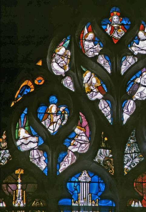 Much glass from the C16 although it has been much damaged and restored since then; the church was badly damaged in the Second World War and the sensitive restoration was carried out by Jacques Bony and his atelier |
