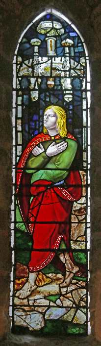 A composite figure of St John made from glass of the C14, C16 and C19.Part of the ground is from a Crucifixion scene now in Lichfield cathedral and formerly from Herkenrode Abbey in Belgium. The C14 canopy may well be from Winchester College chapel.