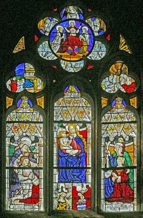 The Virgin and Child with donors Hans Bonn and his wife and their patron saints James and Christopher. Above is the Last Judgement with souls rising and being led to heaven and hell